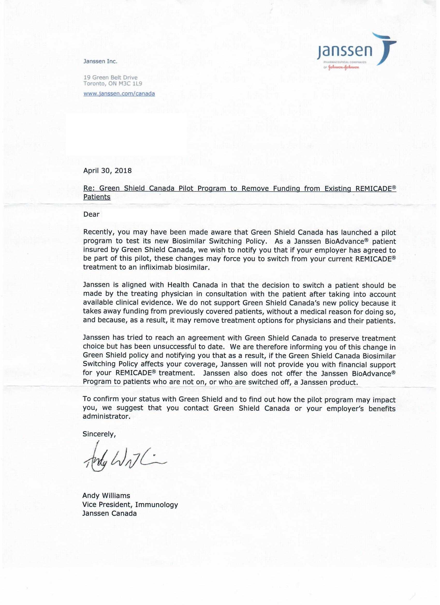 When the not-for-profit benefits carrier Green Shield Canada launched a pilot project earlier this year that allowed participating companies to force their workers to switch from brand-name Remicade and Enbrel to a biosimilar – or pay the difference in cost – Janssen sent a letter directly to Remicade patients warning them they would lose their BioAdvance services if they switched.