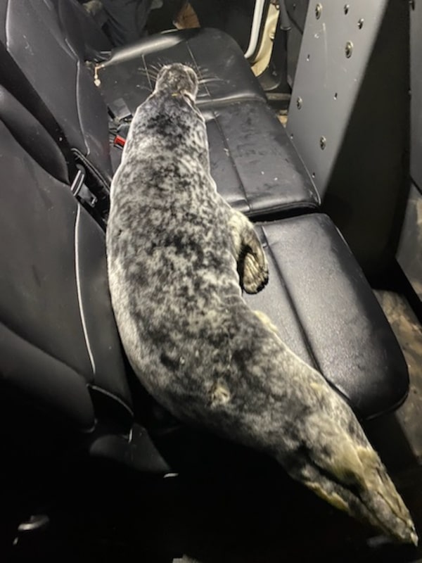 George the seal rests in the back of RCMP Const. Matthew Muirhead’s patrol vehicle on Feb. 9, 2023.contributed by RCMP Const. Matthew Muirhead/Supplied