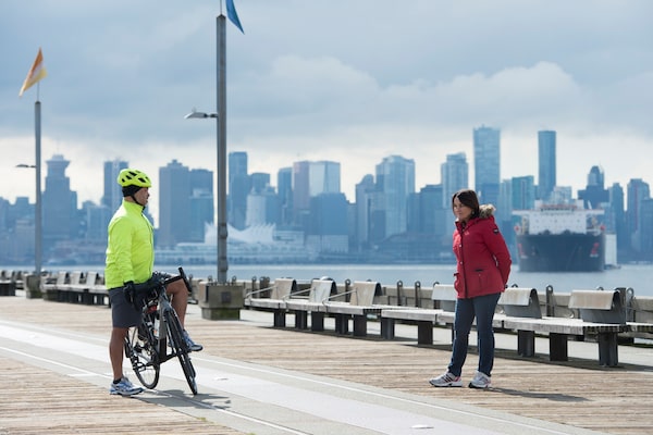 Two people keep their distance while speaking to one another on the pier in North Vancouver, B.C., on March 24, 2020.JONATHAN HAYWARD/The Canadian Press