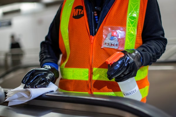 A worker disinfects a subway station in New York City on March 4, 2020.EDUARDO MUNOZ/Reuters
