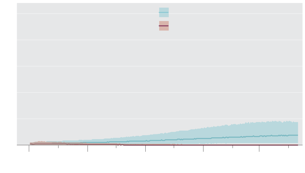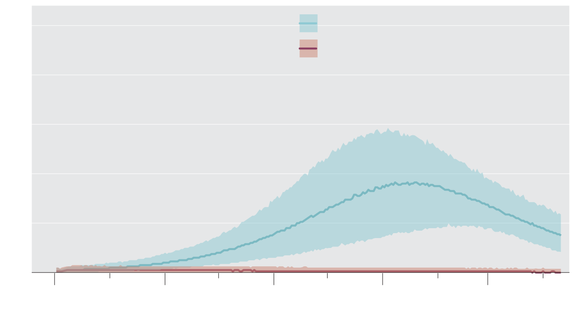 In this model, a complete vaccine escape would be off the charts and force us back to a new round of lockdowns. This scenario shows only a partial vaccine escape. Here, a variant takes hold that vaccines are less able to manage. Infections and hospital admissions rise steeply in the absence of social distancing. But while a fourth wave is inevitable in this scenario, its impact is lessened by the higher vaccination rate.