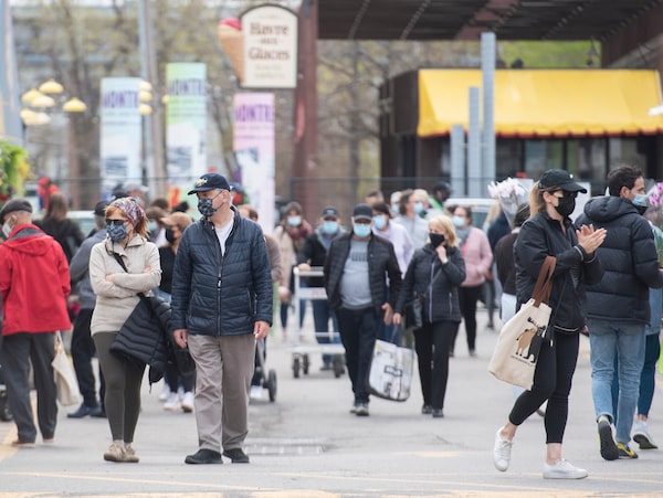 People wear face masks as they shop at the Atwater Market in Montreal on May 8, 2021.Graham Hughes/The Canadian Press