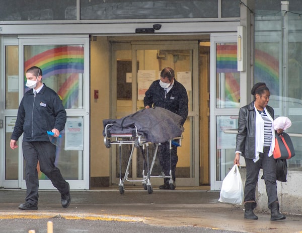 Funeral home workers remove a body from the Centre d'hebergement Sainte-Dorothee in Laval, Que., on April 13, 2020.Ryan Remiorz/The Canadian Press