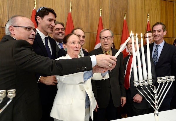 Supreme Court of Canada Justice Rosalie Abella, third from left, lights the menorah with Cantor Rabbi Daniel Benlolo, left, and Prime Minister Justin Trudeau during Hanukkah on the Hill celebrations on Parliament Hill in Ottawa on Dec. 5, 2018.Justin Tang/The Canadian Press