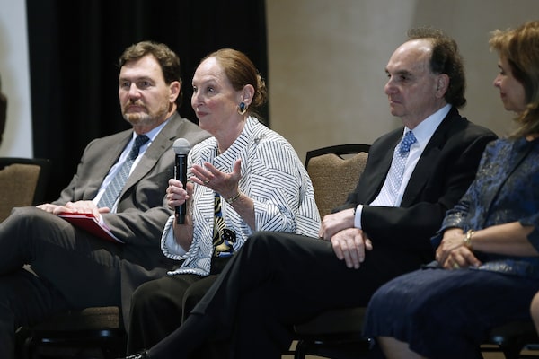 Supreme Court of Canada Chief Justice Richard Wagner, left, and fellow judges Michael Moldaver, second from right, and Andromache Karakatsanis, right, listen in as judge Rosalie Abella responds to a question during a question-and-answer session at Canadian Museum of Human Rights, in Winnipeg, Sept. 25, 2019.John Woods/The Canadian Press
