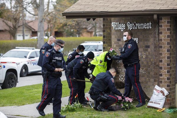 Durham Regional Police officers plant flowers outside Orchard Villa on May 10.Cole Burston/Getty Images