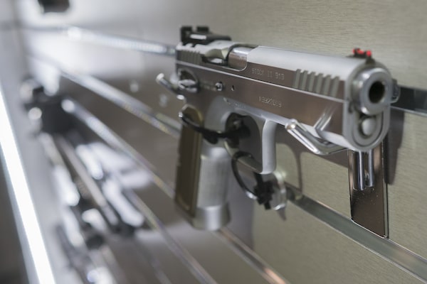 A handgun sits on a display rack at Sept. 6's Tactical and Competitive Shooting Sports Show in Mississauga. A string of shootings in Toronto and other cities last year has renewed debate about possible bans on handguns and assault rifles.J.P. MOCZULSKI/The Globe and Mail