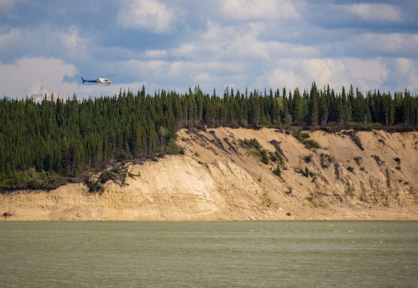An RCMP helicopter watches the banks of the Nelson River near where the dive team is searching.