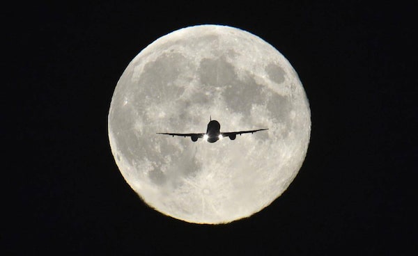 A passenger aircraft, with the full Harvest moon seen behind, makes its final approach to landing at Heathrow Airport in west London, Sept. 19, 2013.Reuters