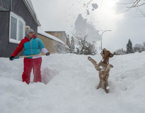 Rene Lanteigne gets help from her dog, Molly, as she shovels her walk on Feb. 13, 2019 in Deux-Montagnes, Que.Ryan Remiorz/The Canadian Press