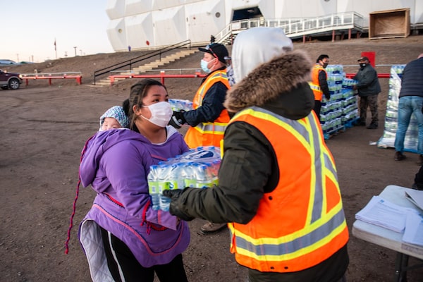 Andrea Salluviniq receives bottles of water from City of Iqaluit staff and volunteers on Oct. 15, 2021.Pat Kane/The Globe and Mail