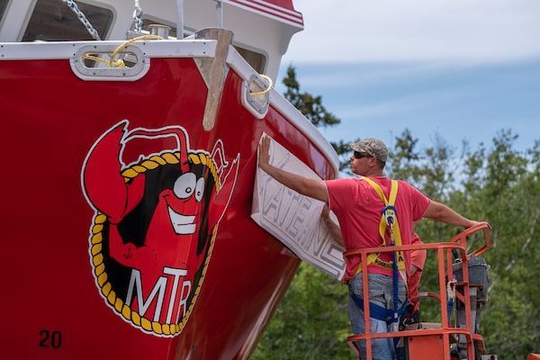 A newly finished lobster fishing boat waits on a trailer in a yard at Wedgeport Boats, like a displaced sea creature ready to return. The Porsche-red hull gleams in the Nova Scotia sun. Standing on the ground in its shadow, the vessel’s owner, Mark Rogers, watches with satisfaction as the vinyl sticker – the kind used for race cars – is applied to the bow, revealing a muscled, smiling cartoon lobster.
