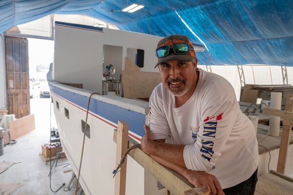 So it’s a good day at Wedgeport Boats, and not only because there’s a cool wind to cut the afternoon heat. Not counting the fleet on land for serving or retrofitting, there are six boats in various stages of construction – a hull with its ribs still showing in one bay; workers fibreglassing a nearly finished hull in another.