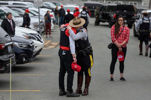 Members of the RCMP console each other as friends, colleagues, and members of the community gather following an emotional moment of silence for slain RCMP Const. Heidi Stevenson, a 23-year member of the force and mother of two.Darren Calabrese/The Globe and Mail