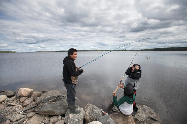Children fish on the shores of Attawapaskat Lake. For Neskantaga's youth, the boil-water regime is the only way they've ever known of getting drinkable water.