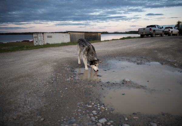 A dog drinks from a puddle near the Neskantaga waterfront. Dogs without collars or tags are a common sight around the village.
