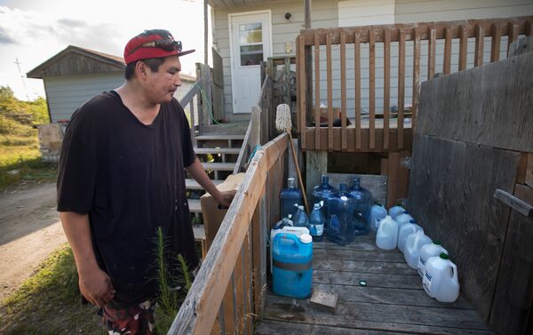 Every three days, Norm Moonias brings jugs to a wooden shed that houses a reverse-osmosis water purifier. He has to supply the nine people living in his home.