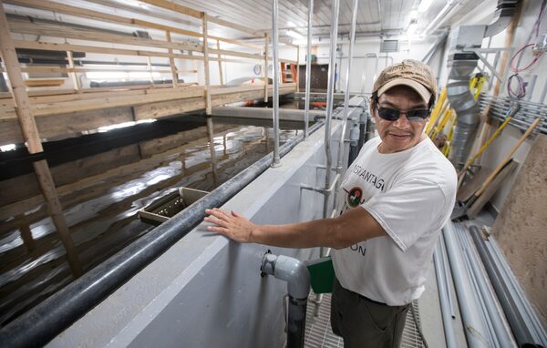 Wilfred Sakanee, one of the plant operators at the water treatment facility, stands beside the older filtration tanks.