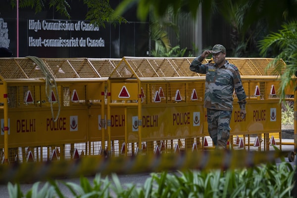 An Indian paramilitary soldier stands guard next to a police barricade outside the Canadian High Commission in New Delhi, India on Sept. 19, 2023. India has temporarily suspended all visa services for Canadians.Altaf Qadri/The Associated Press
