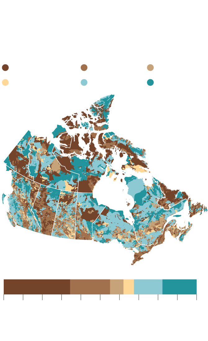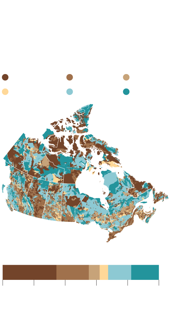 Among the areas that emerge from the exercise are large swaths of Labrador, peatlands west of Hudson Bay and much of Baffin Island. Areas with high numbers of species at risk, including B.C.’s Okanagan Valley and the Great Lakes and St. Lawrence River lowlands, also register prominently.