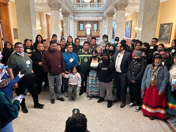 Neskantaga Chief Wayne Moonias, centre in green, speaks alongside First Nations community members during an improvised press conference inside the Ontario Legislature, at Queen's Park, in Toronto, on March 29. First Nations across northern Ontario have launched a lawsuit against the province and the federal government over decision-making powers.Allison Jones/The Canadian Press