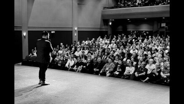 Mr. Srinivasan on the stage at the inaugural South Western International Film Festival (SWIFF) in 2015. His love of film led him to create the festival in his hometown of Sarnia.SWIFF