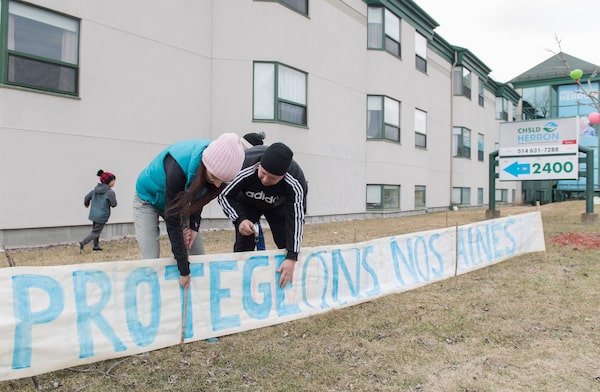 People place a sign translating to 'Protect our Seniors' outside Maison Herron, a long-term care home in the Montreal suburb of Dorval, on April 12, 2020.Graham Hughes/The Canadian Press