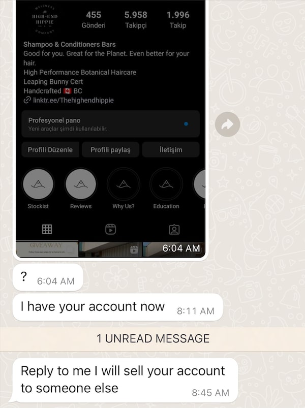 A screenshot of a threat issued to Amy Hamilton, the CEO of B.C.-based hair-care company The High-End Hippie, when her business account was hacked. Ms. Hamilton abandoned her hacked account after she couldn’t get help from Meta.Supplied