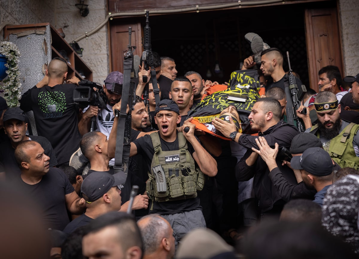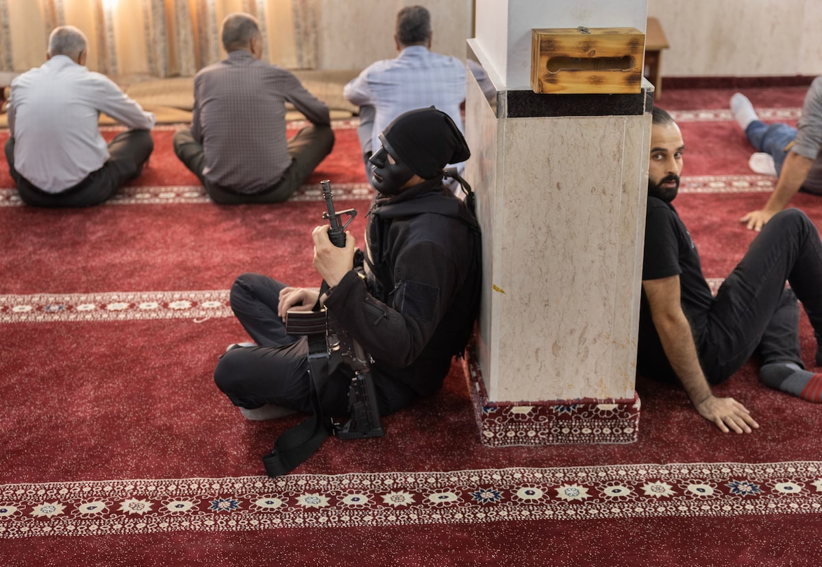 While in the Jenin refugee camp in the West Bank, Mr. Tomasevic photographed a number of Islamist militant funerals. On Oct. 27, two fighters were killed in a raid by Israeli forces. Inside the mosque, one mourner wore a mask and carried a rifle – “quite normal in conflict,” Mr. Tomasevic said. When the mourners carried the body out, Mr. Tomasevic captured a compelling image of mourners carrying rifles and shouting, while one man places his hand tenderly on the head of the deceased.