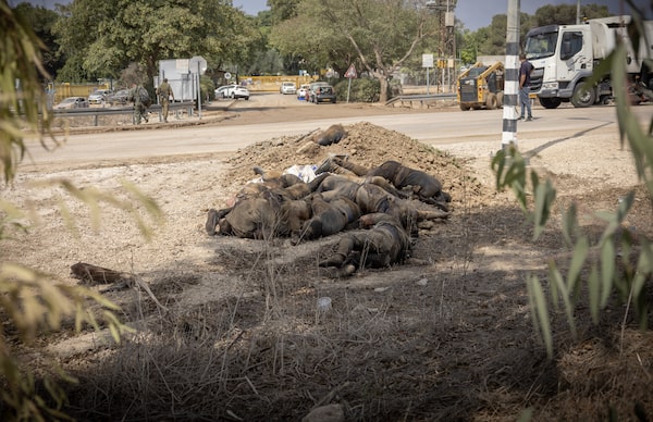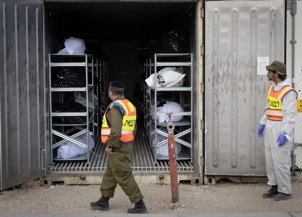 After the Oct. 7 attacks, the remains of victims were kept in shipping containers at the Israeli Defence Forces’ Shura military base, in some cases for weeks as the IDF waited for the victims to be identified. Though he prefers to travel on his own, Mr. Tomasevic asked to visit the facility with other journalists – balancing access with military and government forces is difficult. In an especially wrenching moment, a spokesman indicated one of the makeshift shrouds and showed him the contents, saying “this is the body of a child.”