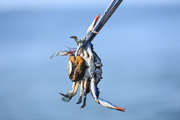 A fisherman shows a female blue crab with eggs in the lagoon of Scardovari, south of Venice, Italy, on Aug. 11. The blue crab is a particularly aggressive species threatening local shellfish and fishPIERO CRUCIATTI/AFP/Getty Images