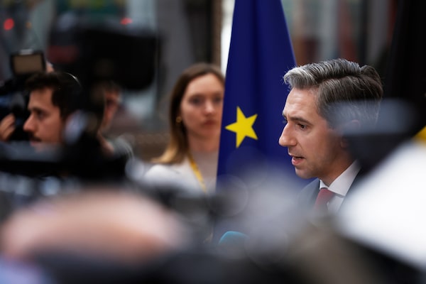 Ireland's Prime Minister Simon Harris, right, speaks with the media as he arrives for an EU summit at the European Council in Brussel, on June 17.Omar Havana/The Associated Press