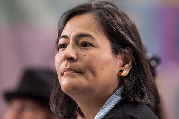 Commissioner Michele Audette listens as Bernie Williams testifies at the final day of hearings at the National Inquiry into Missing and Murdered Indigenous Women and Girls, in Richmond, B.C., on April 8, 2018.DARRYL DYCK/The Canadian Press