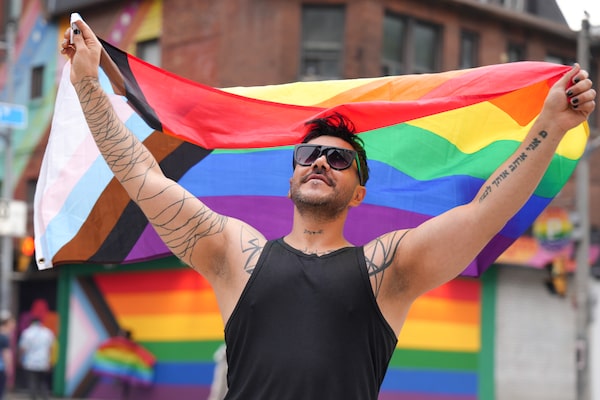 Zhya Aramiy, a newcomer to Canada originally from Kurdistan, Iraq, holds up a Pride flag in Toronto's Church-Wellesley district on June 26. Aramiy is just one of hundreds of LGBTQ+ newcomers to Canada who are celebrating their first Pride in Toronto this month.Chris Young/The Canadian Press