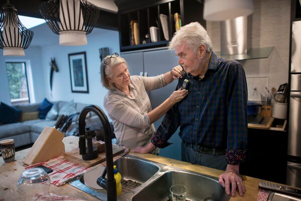 Jo Kennelly places a device beside Frank Plummer’s shoulder that turns his deep brain stimulation on and off on Dec 10 2019.Fred Lum