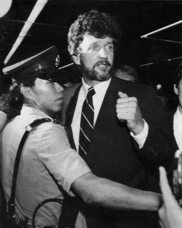 A police officer escorts Mr. Burns out of Hong Kong's Kaitak airport in 1986, when he was expelled from China. Hong Kong was then under British rule, outside Beijing's official reach.Dick Fung/The Associated Press
