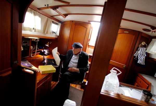 Mr. Newman, then 82, is shown in 2011 on his comfortably apportioned yacht Grace Note, where he did much of his writing. A naval reservist since 1947, he was a longtime sailor usually seen sporting a Greek fisherman’s cap.Peter Power/The Globe and Mail