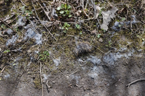 At top, water bottles and firewood lie at an encampment near the entrance to l'Anse-à-l’Orme. The tufts of fur shown at bottom are the only leftovers of a predator killing its prey.