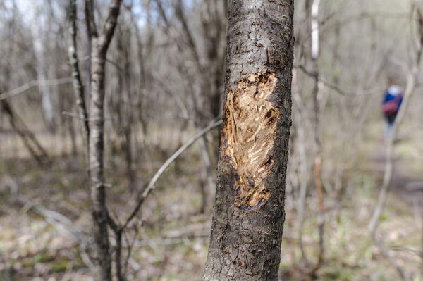 Suspected animal markings are seen on a tree at l’Anse-à-l’Orme.