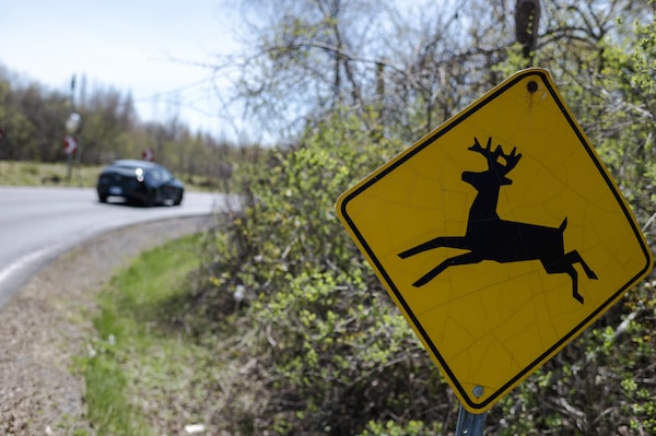 A sign warns motorists of deer beside the l’Anse-à-l’Orme park on the west side of the Island of Montreal. Gunshots are a common sound here, and signs of legal hunting are easy to spot.Photography by Andrej Ivanov/The Globe and Mail