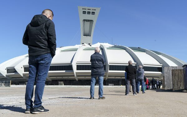 People wait in line outside Montreal's Olympic Stadium to receive the Oxford-AstraZeneca COVID-19 vaccine on April 8, 2021.Paul Chiasson/The Canadian Press