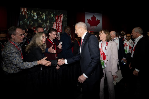 Mark Carney greets supporters after delivering a victory speech at the Liberal Party of Canada convention in Ottawa, on Sunday, March 9, 2025.Spencer Colby/The Globe and Mail