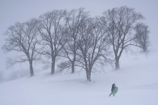 A person with a sled at Garrison Grounds as a winter storm continued to hit Halifax on Sunday, Feb. 4, 2024.Darren Calabrese/The Canadian Press