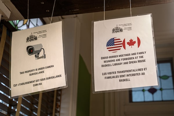 Above: A stone pilon and non-loitering sign mark the Canada-U.S. border in Stanstead, Que. Below: Inside the Haskell, a sign warns visitors that cross-border family reunions are forbidden, and the building is under surveillance.