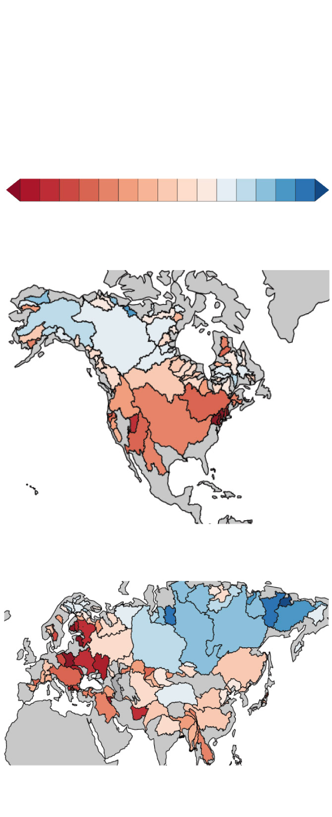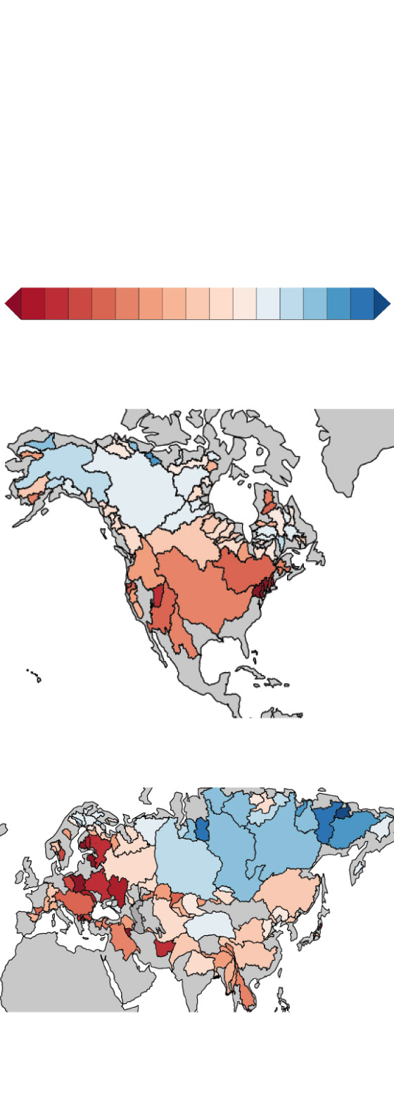 Northern Hemisphere. Here the difference over a 40-year period is shown for individual watersheds associated