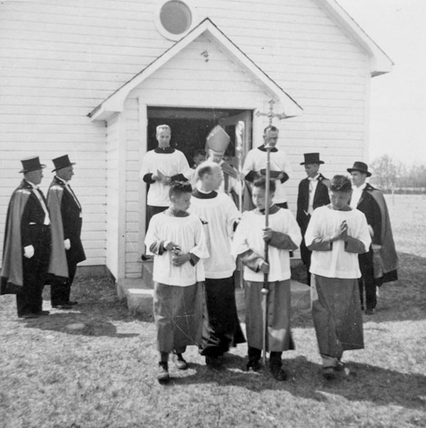 Clergy and altar boys at Marieval Residential School in Saskatchewan, which was run by the same Catholic order as Lower Post.Société historique de Saint-Boniface/Oblats de Marie-Immaculee du Manitoba