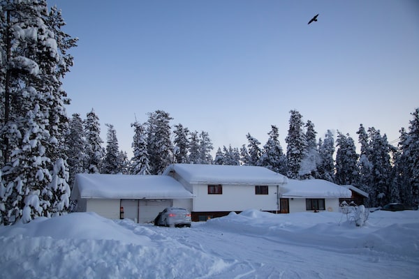 A raven soars over the Chief house in Watson Lake. These days, Mr. Chief, 82, goes out in the bush for food and firewood and spends nights at home with Sue.Crystal Schick/The Globe and Mail