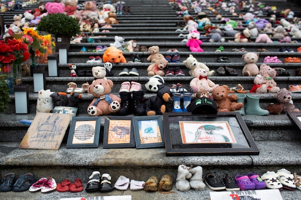 Shoes and children's toys are left on the steps of the former Vancouver Art Gallery North Plaza on Sept. 30, the first National Day for Truth and Reconciliation, as communities across Canada honoured lost children and survivors of residential schools.Amy Romer/Reuters