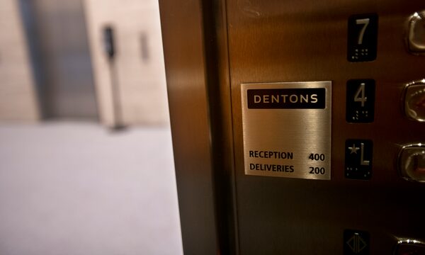 A small plaque for the law firm Dentons, placed in an elevator at TD Centre on Feb. 22, 2021.Fred Lum/The Globe and Mail