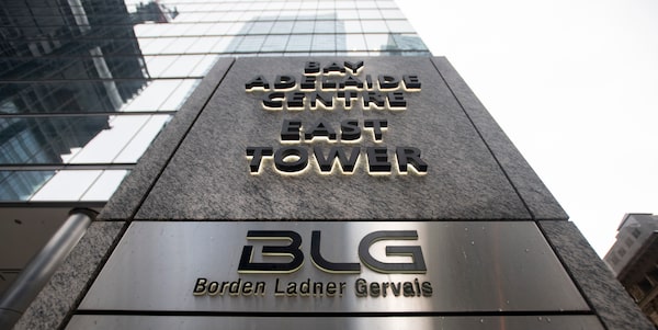 A sign for the law firm Borden Ladner Gervais outside the Bay Adelaide Centre in Toronto on Feb. 22, 2021.Fred Lum/The Globe and Mail